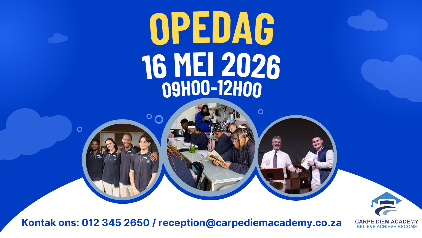 Carpé Diem Academy is ‘n dubbel-medium hoërskool in die hartjie van Pretoria Oos. Ons is geregistreer by die Department van Onderwys asook Umalusi. Ons streef daarna om die beste onderwys aan leerders te verskaf terwyl ons elke leerder help om hul volle potensiaal as jongmense te bereik. Ons bemagtig die leerders om die wêreld buite die skool aan te pak, en rus hulle toe met die nodige vaardighede om sukses te behaal in alle aspekte van die lewe